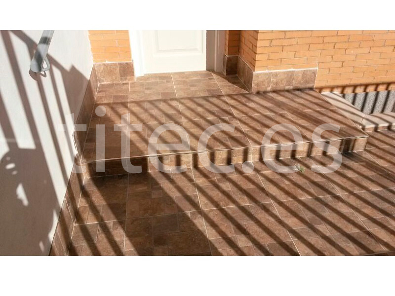 Trabajo de solado porche exterior. Realizado en gres cerámico, con junta ancha, en formato 25×25 cm2.