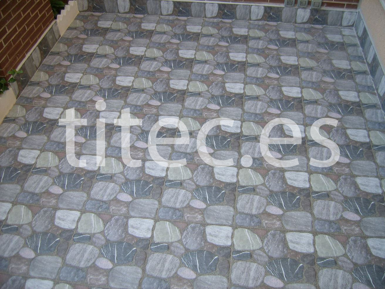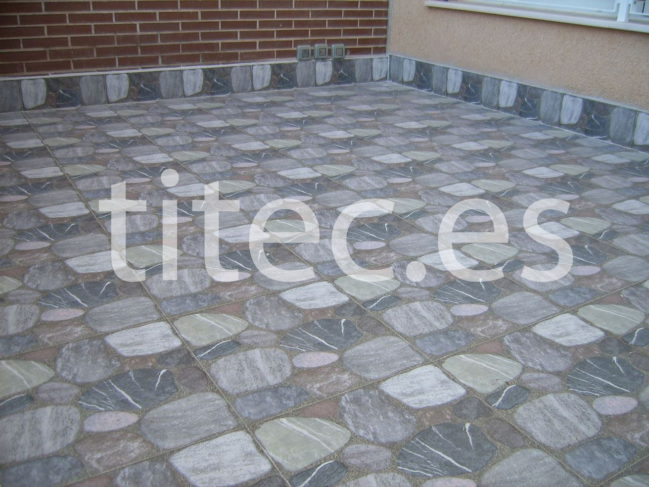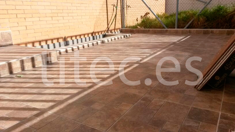 Trabajo de solado de patio exterior. Realizado en gres imitación piedra natural, en formato 45×45 cm2. Trabajo realizado para particular.