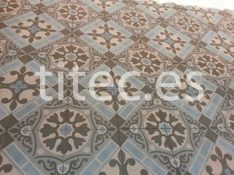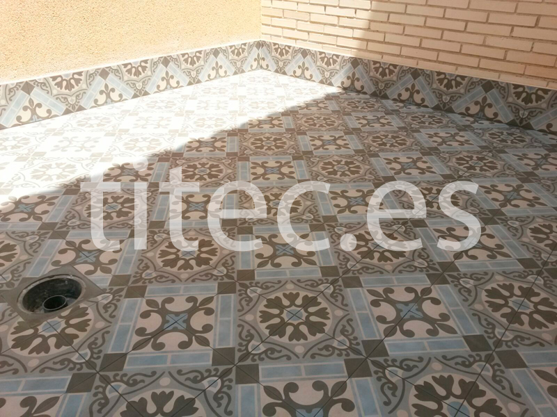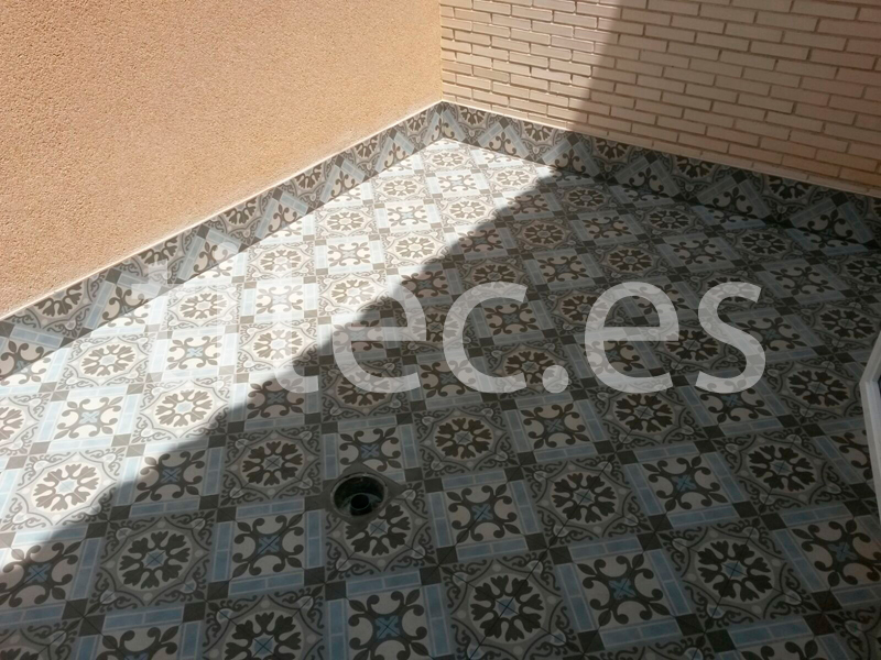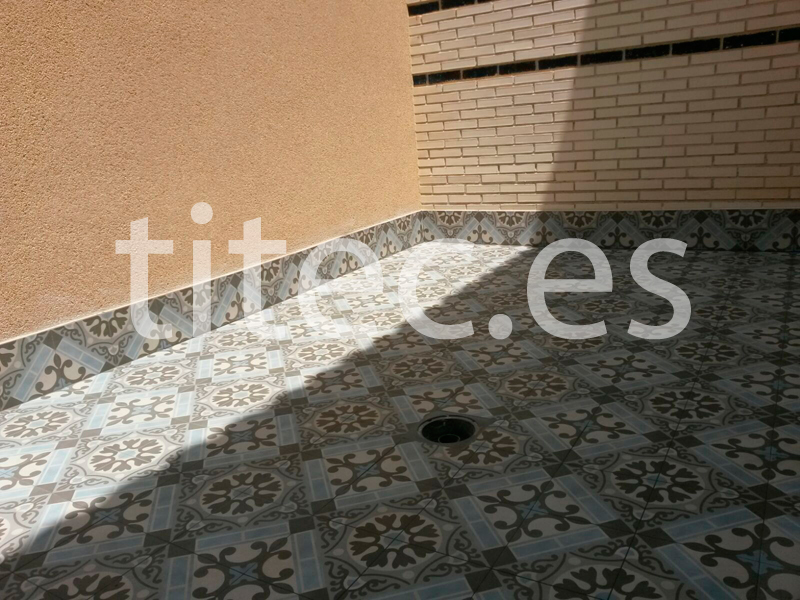 Solado de patio exterior en una vivienda. Solado tipo mosaico imitación antiguo.
